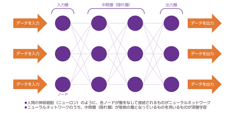この機械学習の一つに「深層学習」(ディープラーニング)というものがあります。多数の層からなるニューラルネットワーク(人間の脳構造を模した数理モデル)を用いて、パターンやルールを発見するうえでデータの何に注目すれば良いかをコンピューター自身が判断する手法です。ゾウとキリンの写真を大量に見せた際にどこに着目するかもコンピューターが判断するイメージです。
